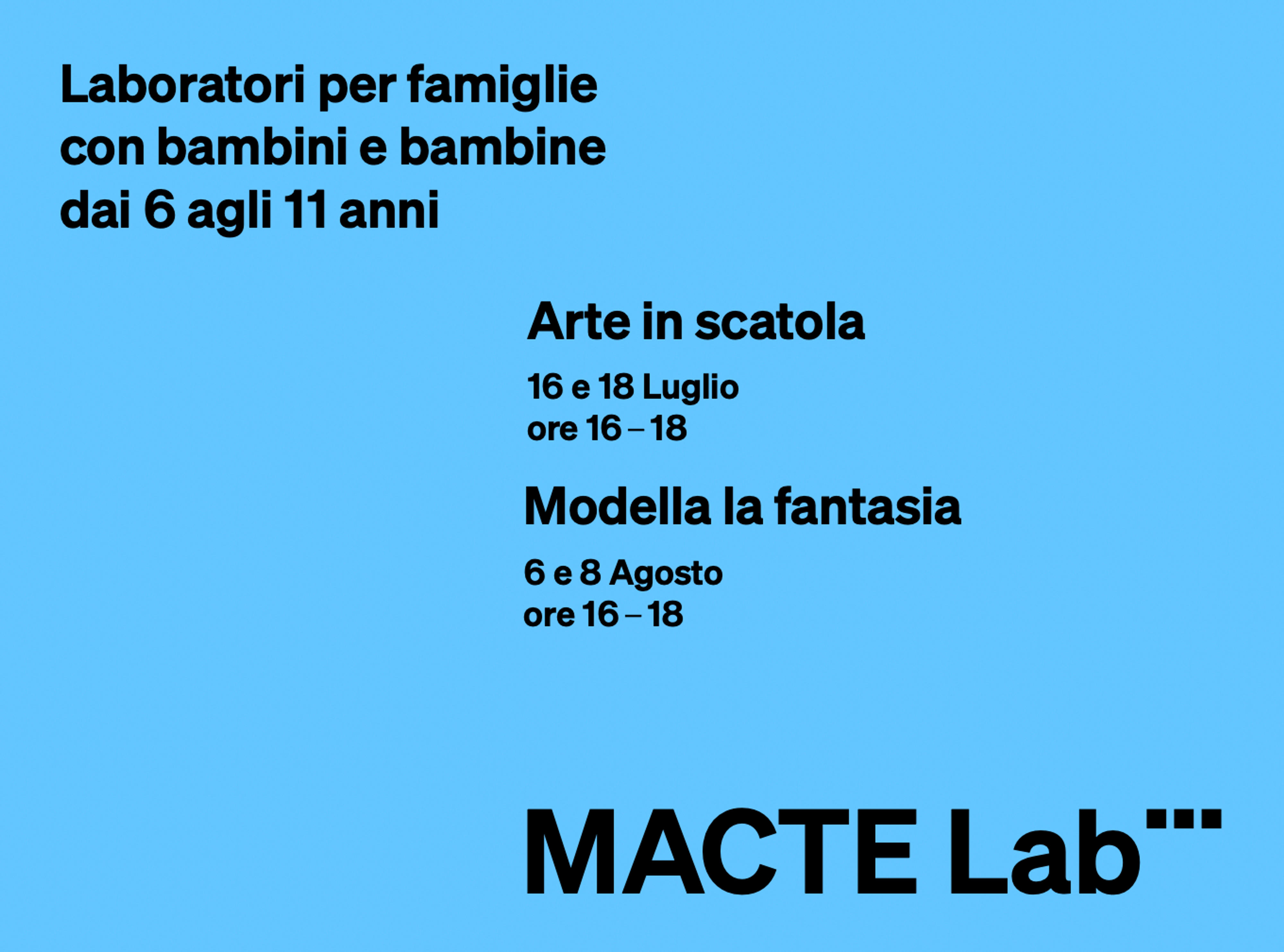 ore 16.30 MACTE – Museo di Arte Contemporanea di Termoli Arte in scatola Laboratori per famiglie con bambini e bambine dai 6 agli 11 anni costo a persona: 3€ Dopo la visita del museo, il laboratorio prende ispirazione dall'opera di Matteo Fato, in cui poter immaginare e dipingere paesaggi fantastici da portare ovunque. Per maggiori informazioni: barbara@larafacco.com